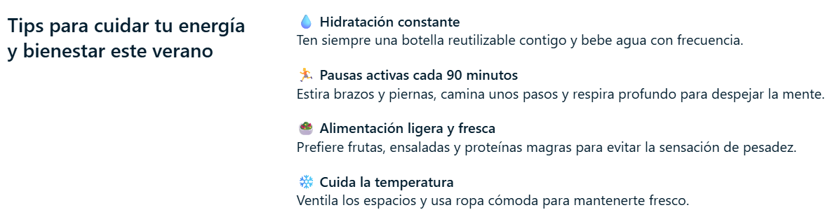 Pequeños hábitos marcan una gran diferencia. Cuidar tu energía y tu seguridad este verano no solo te permite disfrutar más, también protege a quienes te rodean. Recuerda: cada acción cuenta para que vivamos un verano saludable, seguro y lleno de buenos momentos. 🌞